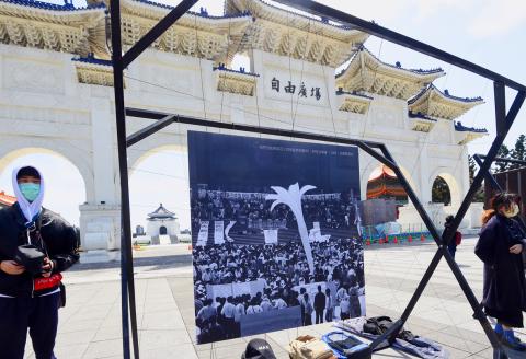 Representatives from several groups yesterday gathered in front of the main gate of Taipei’s Liberty Square to mark the 30th anniversary of the beginning of the Wild Lily student movement.