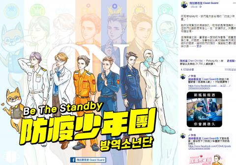 In other news, the Coast Guard Administration on March 5 introduced fictional characters belonging to what it calls the “epidemic prevention boy band” (防疫少年團), or “Be The Standby” in English, on Facebook as part of its public awareness efforts to combat COVID-19.