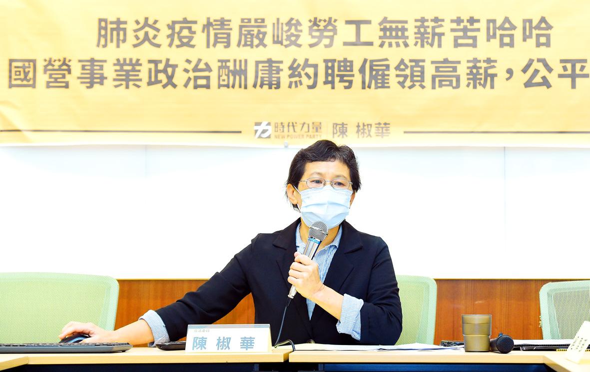 NPP Legislator Chen Jiau-hua (陳椒華) said that during a question-and-answer session last year, Minister of Economic Affairs Shen Jong-chin (沈榮津) promised to review and improve the situation after former NPP lawmaker Huang Kuo-chang (黃國昌) provided Shen with a list of contract appointments, all of whom remain in their positions.