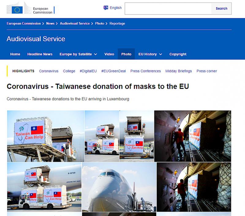 The EU on Thursday announced that it had received surgical masks donated by Taiwan and thanked Taiwan for its “gesture of solidarity” in the fight against the COVID-19 pandemic.