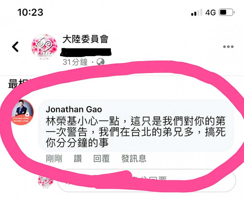 An Internet user named “Jonathan Gao” further threatened Lam on the Mainland Affairs Council’s Facebook page, writing: “Lam you had better be careful — that was only our first warning to you. We have many gangster brothers in Taipei and we have many ways to harass you to death.”