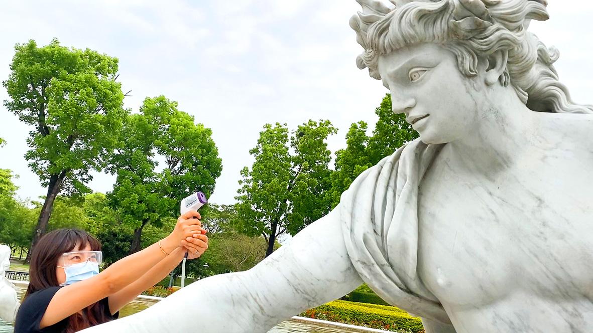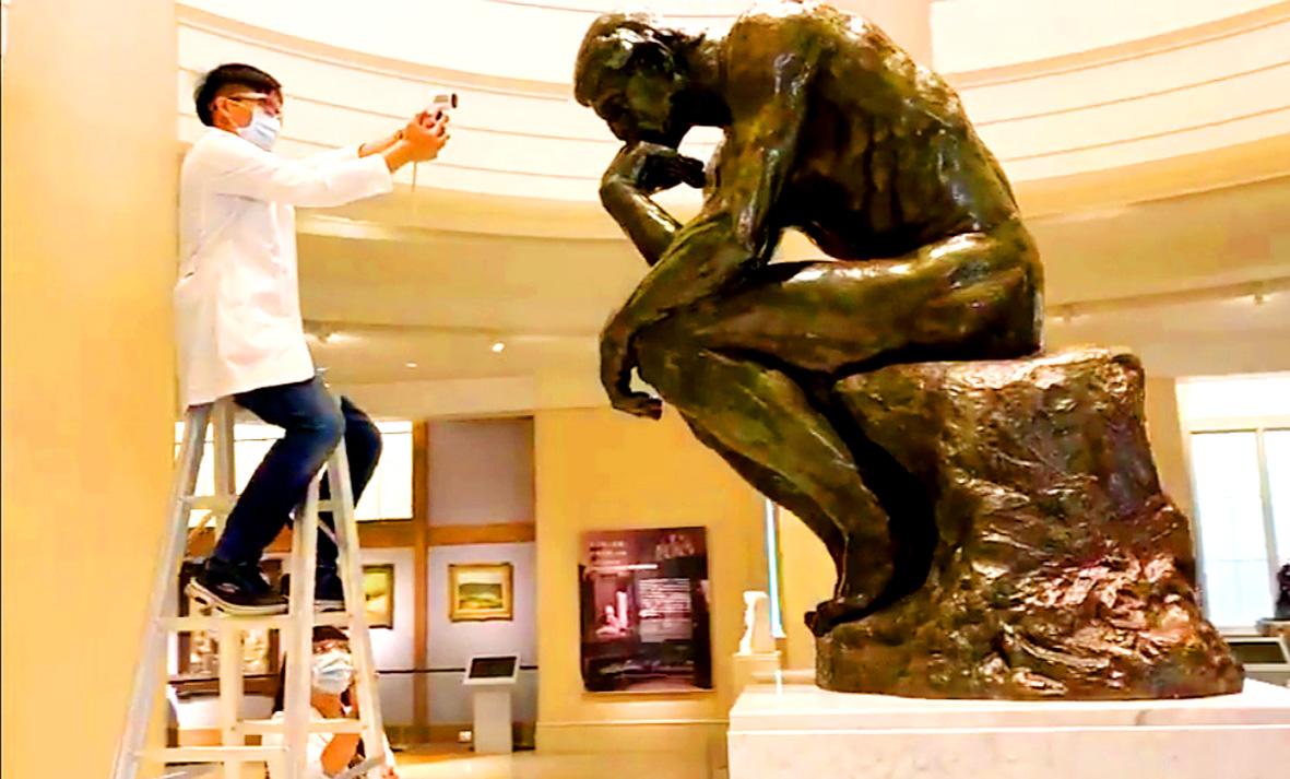 A replica of Auguste Rodin’s The Thinker makes an appearance, with staff reaching up to check his forehead temperature. Replicas of the Greek statue Venus de Milo and the Roman statue Apollo Belvedere are also featured.