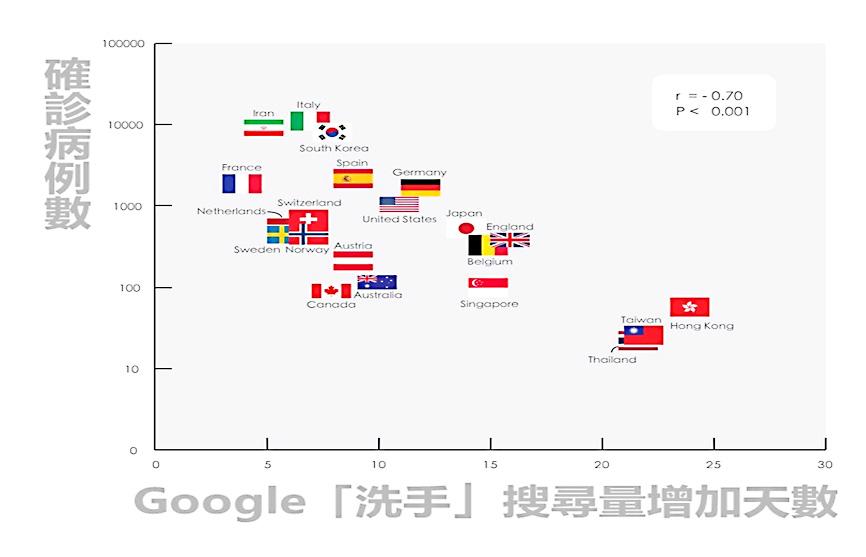 Web searches for “hand washing” was correlated with lower confirmed COVID-19 cases in 21 nations, a National Health Research Institutes (NHRI) analysis of Google’s search data showed, the authors of a study said on Friday.