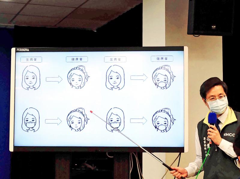 “Many people have asked why several confirmed cases in Taiwan did not spread the virus to other people,” Chang said, pointing to an illustration depicting a healthy person and an infected person interacting in possible scenarios.
