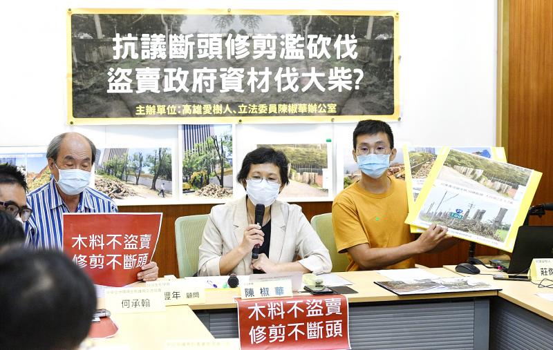 At a news conference held by Chen at the Legislative Yuan, Kaohsiung Tree Lovers’ Association chief executive Chuang Chieh-jen (莊傑仁) said that his research shows that tree-pruning contractors benefit from selling wood gathered during work on public trees to mushroom growers, as the NT$12 billion (US$401.31 million) industry requires large amounts of sawdust.