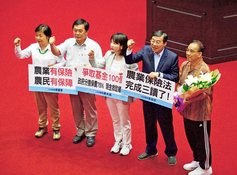 The Legislative Yuan yesterday passed a third reading of the Farmers’ Insurance Act (農業保險法), which aims to safeguard the income of farmers, animal breeders, fishers and foresters from natural disasters and other incidents.