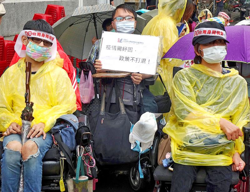 Chinese Nationalist Party (KMT) caucus whip Lin Wei-chou (林為洲), who attended the protest along with other lawmakers from the KMT and the Democratic Progressive Party, said that he hoped the government would dedicate part of approved relief budgets to people with disabilities.