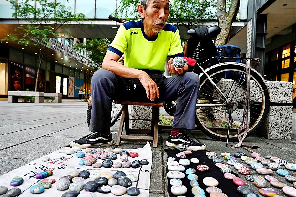 From Chinese characters to traditional Aboriginal totems, artist Wu Rong-bi (吳融賁) has been selling intricately painted pebbles on the streets for the past 40 years.