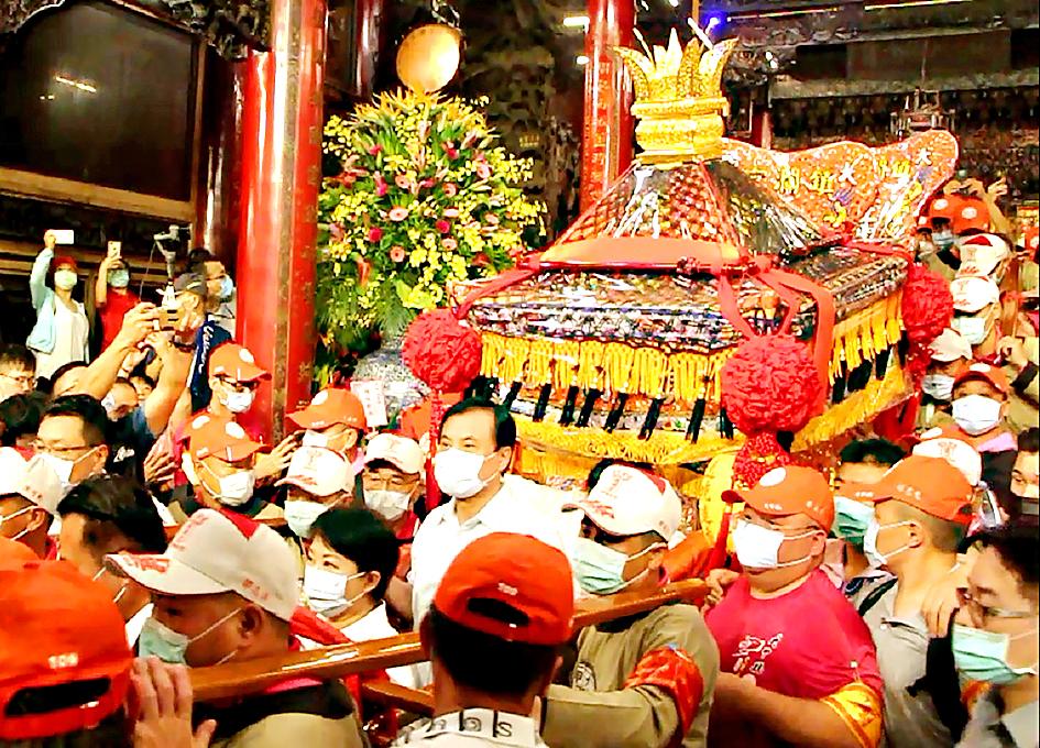 The departure ceremony at Jenn Lann Temple was hosted by temple chairman Yen Ching-piao (顏清標) and attended by several politicians, including Legislative Deputy Speaker Tsai Chi-chang (蔡其昌), Chinese Nationalist Party (KMT) Chairman Johnny Chiang (江啟臣) and Taichung Deputy Mayor Chen Tzu-ching (陳子敬).