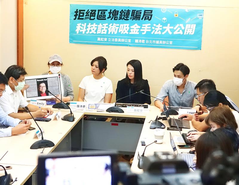 At a media briefing yesterday, Taiwan People’s Party Legislator Ann Kao (高虹安) called for a judicial investigation into Cloud Token, saying that law enforcement authorities should arrest Aai if he is in Taiwan and detain any Taiwanese accomplices.