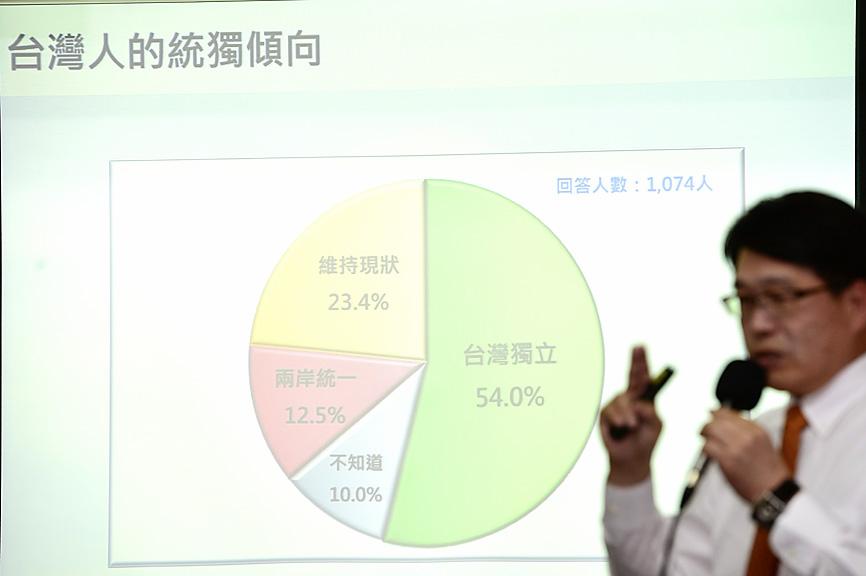 Among the people it surveyed, 54 percent said they support Taiwanese independence, 23.4 percent favored maintaining the “status quo,” 12.5 percent supported unification with China and about 10 percent gave no response or were unsure, the survey showed.