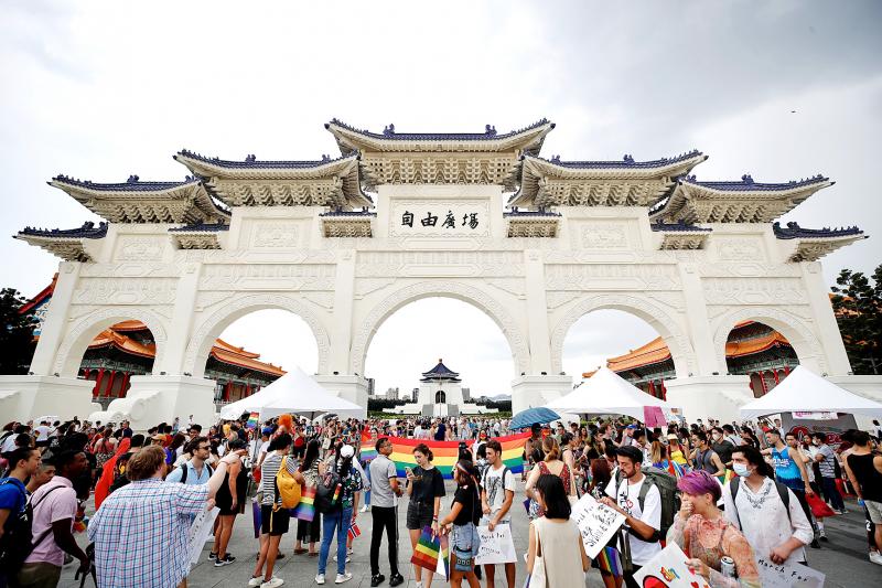 Taipei yesterday played host to one of the few Pride marches around the world on Sunday as the nation’s LGTB+ community and their supporters gathered at Liberty Square for a small march.