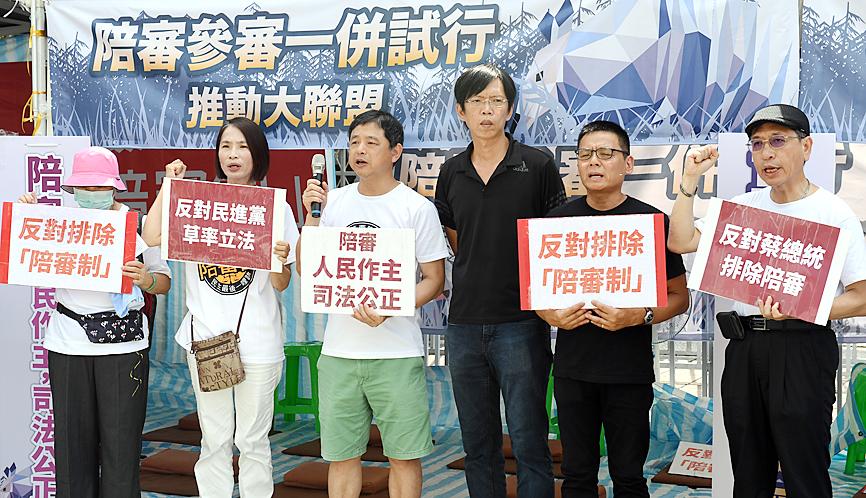 Members of the Judicial Reform Foundation and the Taiwan Jury Association yesterday were joined by supporters for a sit-in at the Legislative Yuan in Taipei to demand that legislators include a proposed jury system on the legislative agenda.