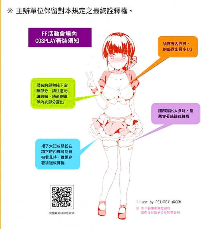 Event organizers said yesterday that to prevent indecent exposure, they have since 2012 implemented rules to regulate the outfits worn by cosplayers inside the expo hall, citing the manga expo they held at National Taiwan University Sports Center eight years ago.