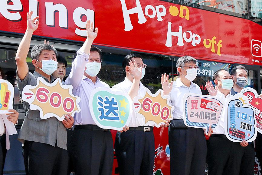 Lin was pressed by reporters on what the Ministry of Transportation and Communications (MOTC) would do to help travel agencies who are still struggling financially, despite the government’s promotion of domestic tourism, before he and Minister of Health and Welfare Chen Shih-chung (陳時中) toured Taipei on a trip organized by the Taipei City Government to promote the Taipei Sightseeing Bus tours.