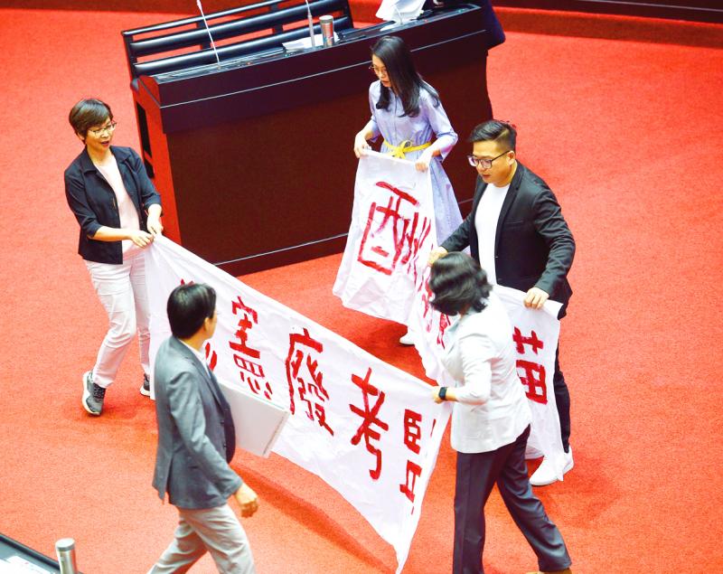 The TPP held a brief protest inside and outside the main legislative chamber, during which TPP caucus whip Lai Hsiang-ling (賴香伶) raised the issue of some Examination Yuan members accepting outside work, including lecturing posts in China.