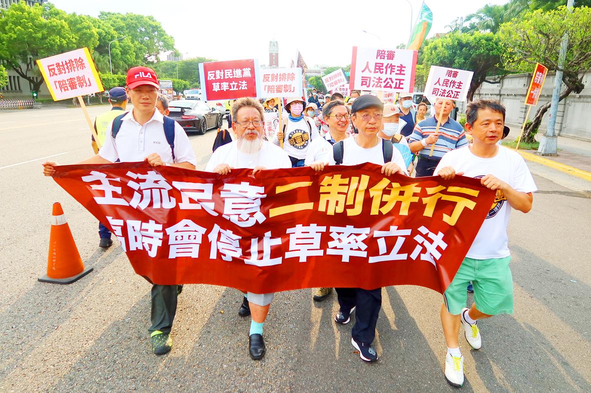 A group of judicial advocates yesterday marched in Taipei as they entered their 20th day of protests to urge Democratic Progressive Party (DPP) lawmakers to include a jury system in a judicial reform bill.