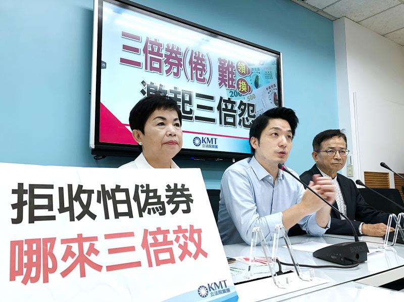 The Chinese Nationalist Party (KMT) caucus yesterday criticized the Triple Stimulus Vouchers and highlighted several flaws in their design, including a lack of anti-counterfeiting features, which has reportedly discouraged some stores from accepting them.
