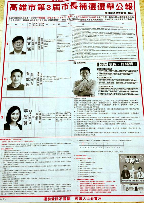 The Chinese Nationalist Party (KMT) is represented by Kaohsiung City Councilor Jane Lee (李眉蓁), the Taiwan People’s Party (TPP) by Kaohsiung City Councilor Wu Yi-jheng (吳益政) and the Democratic Progressive Party by former vice premier Chen Chi-mai (陳其邁).
