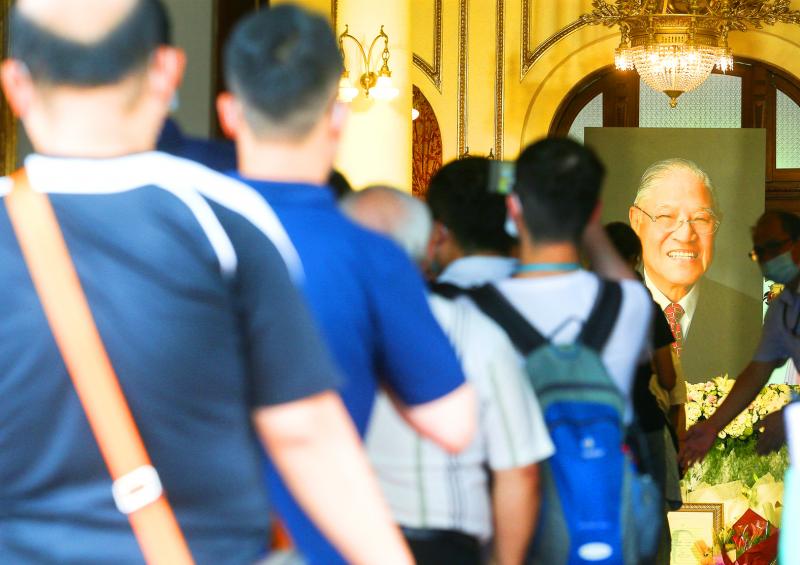 Crowds yesterday gathered at a memorial for late president Lee Teng-hui (李登輝) set up by the Presidential Office at the Taipei Guest House to pay their last respects to Lee, who passed away at Taipei Veterans General Hospital on Thursday aged 97.