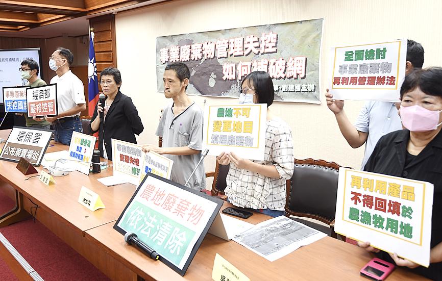 Lawmakers and environmental groups yesterday called for more stringent monitoring and control of industrial hazardous waste at a news conference at the Legislative Yuan in Taipei, saying that pollution has affected Taiwan’s food safety and people’s health.