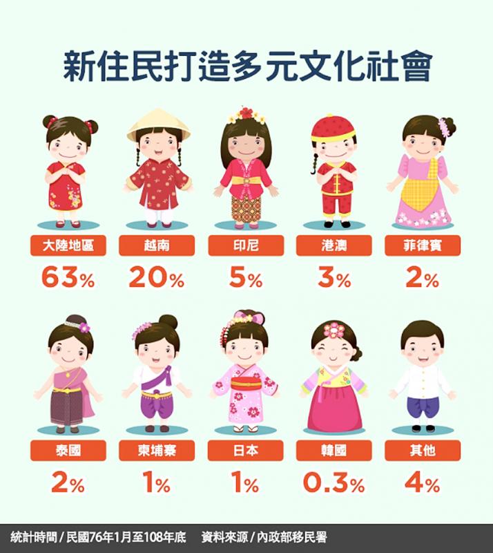 There are more than 650,000 new immigrants who hold Republic of China (ROC) identification cards, exceeding the number of Taiwan’s Aborigines and making them the fifth-largest population group in the nation, the ministry said on Saturday.
