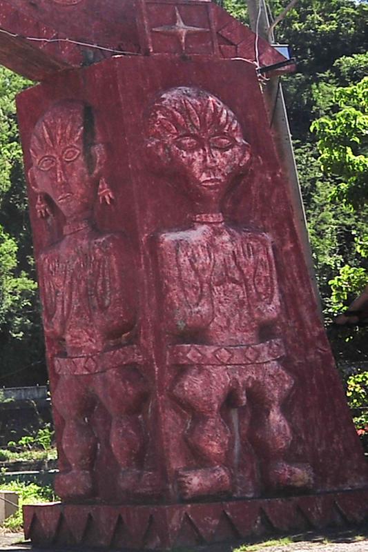 The totems, carved by Hua Heng-ming (華恆明), had depicted Paiwan men and women with their lower bodies uncovered. Feeling that the totems in their original form were indecent, the contractor covered their lower halves with colorful skirts.