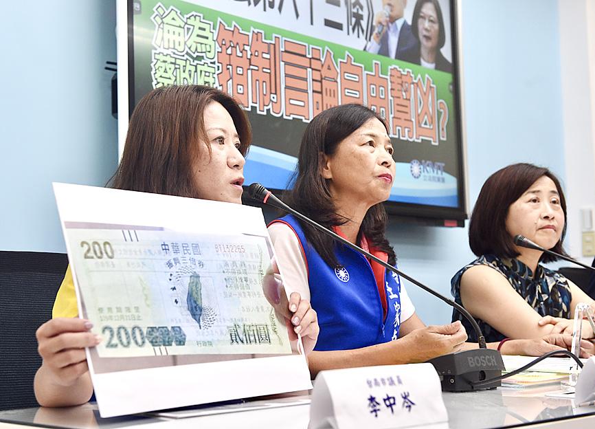At a news conference held at the legislature where they were joined by KMT legislators, Tainan City councilors Wang Chia-chen (王家貞) and Lee Chung-tsen (李中岑) said that Su, who brushed off concerns about fake stimulus coupons being used at small shops in Tainan, was obstructing free speech and “reversing the course of democracy.”