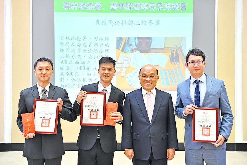 Premier Su Tseng-chang (蘇貞昌) yesterday presented awards to civil servants who were instrumental in investigations that he said helped maintain social stability and safeguard the economy.