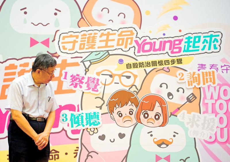 Taipei Mayor Ko Wen-je (柯文哲) said most people think that it is natural to seek medical attention when they are ill or injured, but many people feel embarrassed to see a doctor when they have emotional problems or suicidal thoughts.