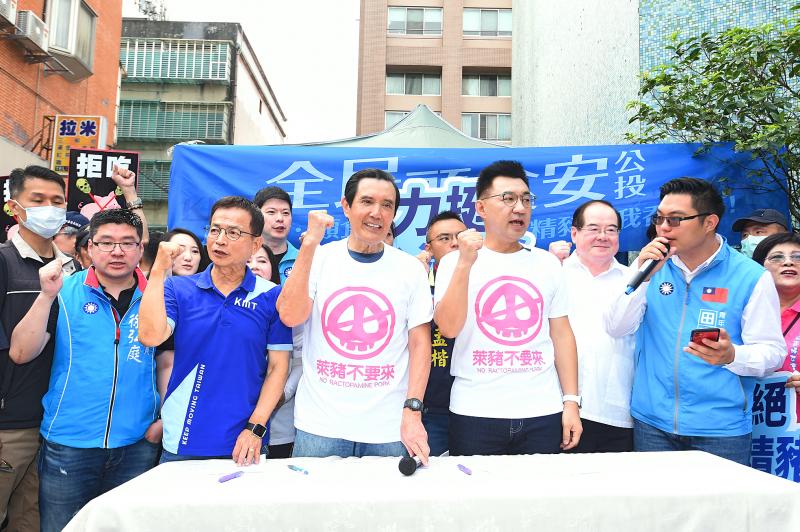Joined by former president Ma Ying-jeou (馬英九), Chiang shouted slogans and said that President Tsai Ing-wen (蔡英文) was “going against the international trend” on the importation of meat containing ractopamine and “turning her back on public opinion.”
