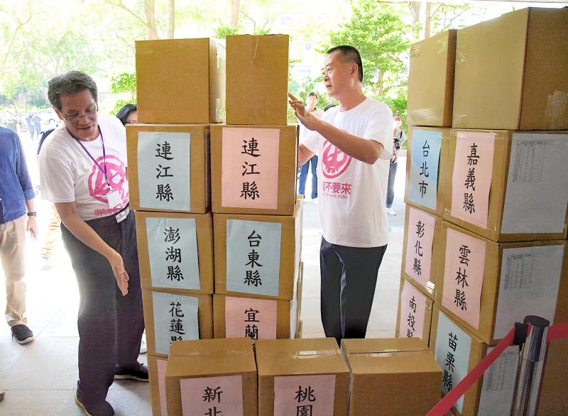 A group of KMT lawmakers and other members led by KMT Chairman Johnny Chiang (江啟臣) yesterday delivered boxes filled with signed petitions to the CEC’s offices in Taipei.