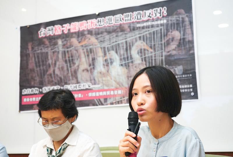 Most duck farmers in Taiwan have adopted cage-free methods, but some still use battery cages that are only as big as an A4 piece of paper and restrict access to water, EAST researcher Tsun Fang-chu (寸舫筑) said.