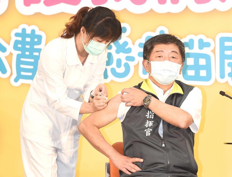 Minister of Health and Welfare Chen Shih-chung (陳時中), who also heads the CECC, Centers for Disease Control (CDC) Director-General Chou Jih-haw (周志浩) and CDC Deputy Director-General Chuang Jen-hsiang (莊人祥) demonstrated getting vaccinated against the flu.