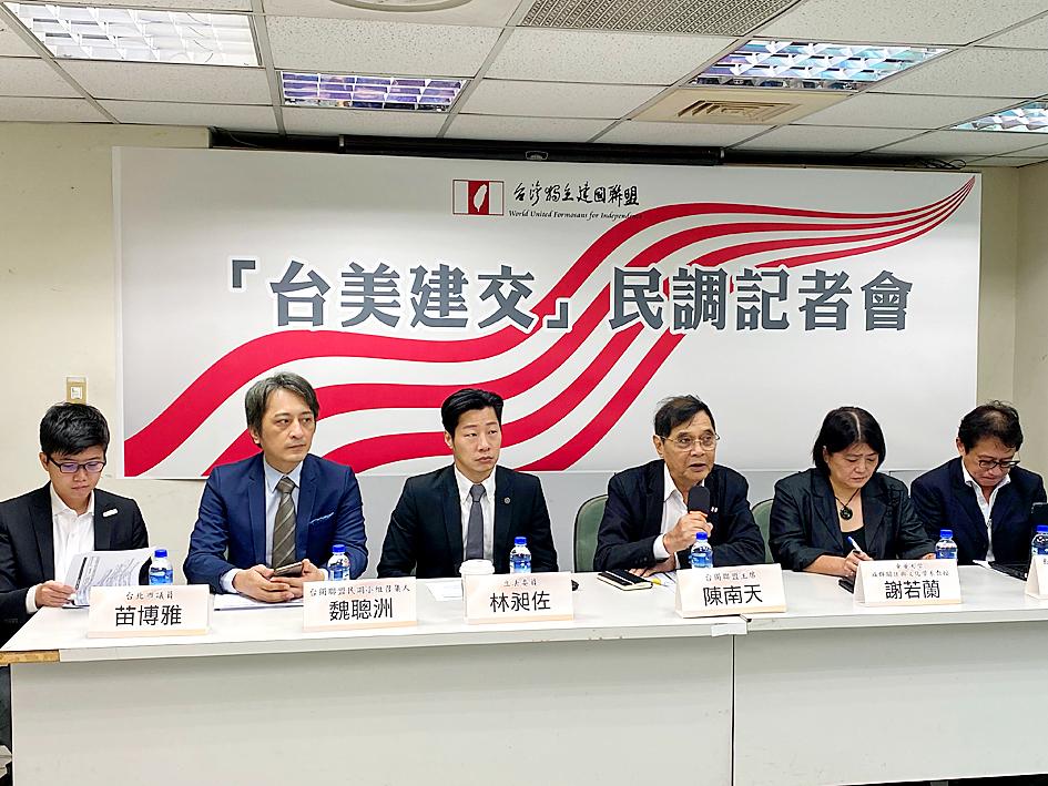 The survey showed that 82.5 percent of respondents support Taiwan and the US establishing formal diplomatic ties, with 37.2 percent saying that Taipei should take steps toward the goal, WUFI chairman Chen Nan-tien (陳南天) told a news conference in Taipei, adding that 15.5 percent said it should be done as soon as possible, although in an orderly fashion.