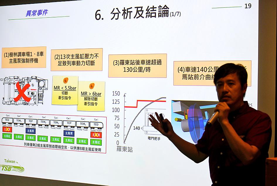 Chief investigator Lin Pei-da (林沛達) highlighted some of the key findings at a news conference in Taipei, including that the Taiwan Railways Administration (TRA) driver operating the train at the time of the incident, as well as the previous driver of the train, failed to report to inspectors malfunctioning air compressors in cars No. 1 and No. 8, where forced outages occurred.