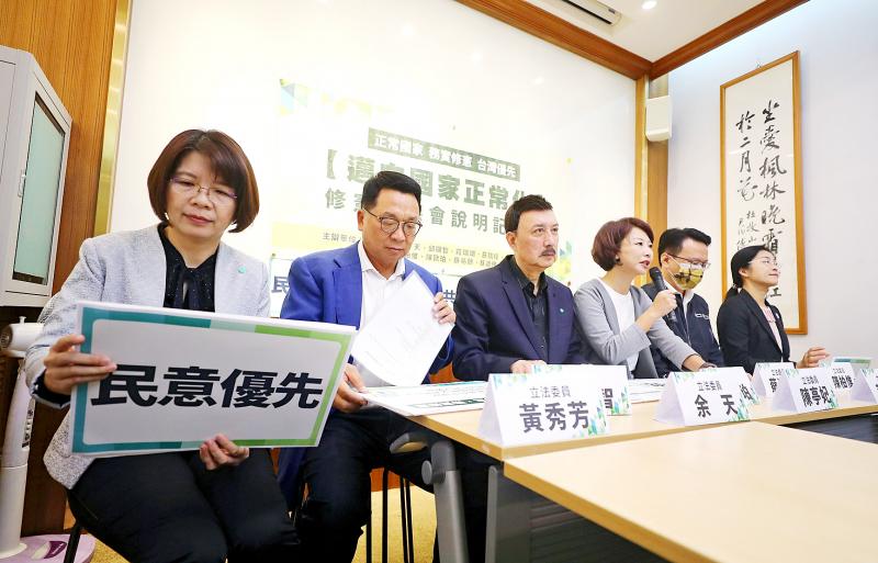 DPP legislators Yu Tian (余天), Huang Hsiu-fang (黃秀芳), Chen Ou-po (陳歐珀), Chuang Ching-cheng (莊競程) and Chen Hsiu-pao (陳秀?) also signed the draft proposal and attended the news briefing, along with New Power Party (NPP) caucus whip Chiu Hsien-chih (邱顯智), who said that other NPP legislators, including Claire Wang (王婉諭) and Chen Jiau-hua (陳椒華), also backed the proposal.