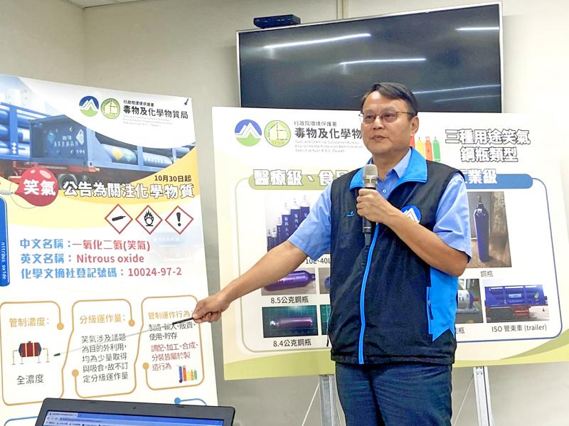 The EPA yesterday listed laughing gas as the first non-toxic chemical regulated under the Toxic Chemical Substances Control Act (毒性化學物質管理法), Toxic and Chemical Substances Bureau Director-General Hsieh Yein-rui (謝燕儒) said.