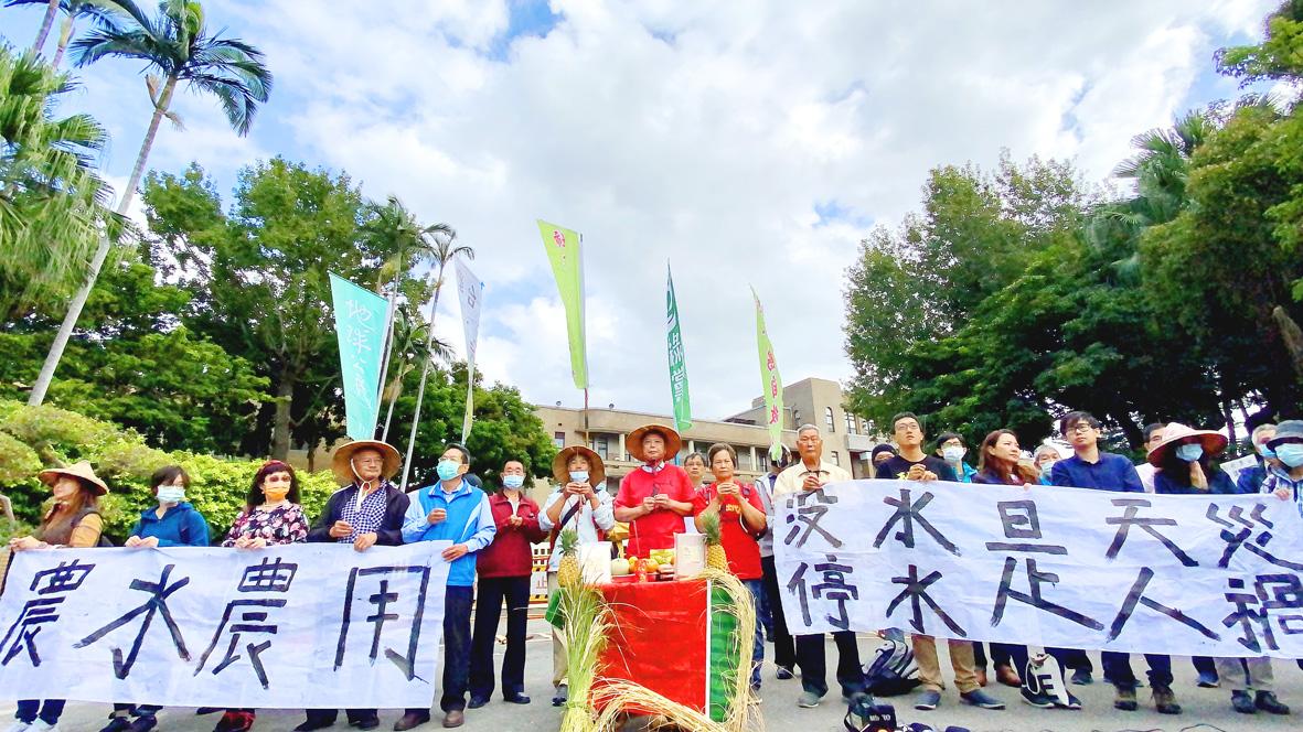 The farmers and environmental groups demonstrated in front of the Executive Yuan building in Taipei, with one of their banners in Chinese reading: “Drought is a natural disaster, but curtailing water supply is human-made disaster.”