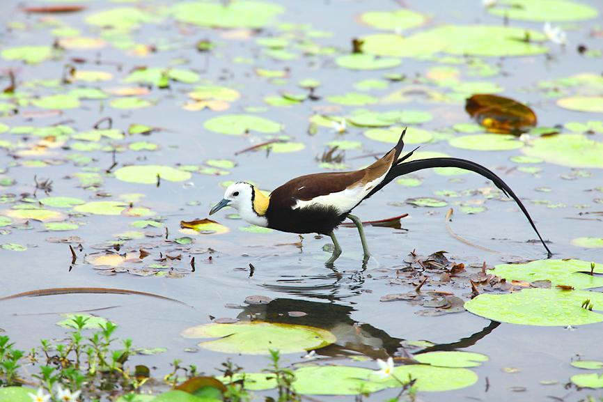 The Ministry of Transportation and Communications is promoting a tour to Tainan’s Jacana Ecological Education Park in recognition of the efforts to restore the propagation of pheasant-tailed jacanas in the past 20 years.