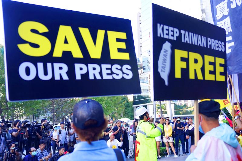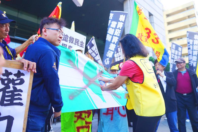 Calling the decision political, protesters sprayed red paint over a Democratic Progressive Party (DPP) flag, and urged members of the public to defend freedom of speech and press freedom by attending a rally in Taipei on Sunday.