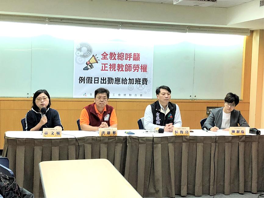 The National Federation of Teachers’ Unions yesterday urged local governments and schools to follow Taichung’s example by giving teachers the option of receiving overtime pay instead of taking compensatory leave due to work performed at weekends, saying that the current policy is “unreasonable” and ignores the rights of teachers.