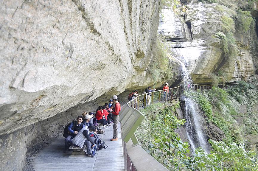 The trail features 10 suspension bridges and many waterfalls, including the Lungkung Waterfall (龍宮瀑布), which falls in front of a long, shallow cave that hikers can traverse to stand behind the curtain of water, he said.
