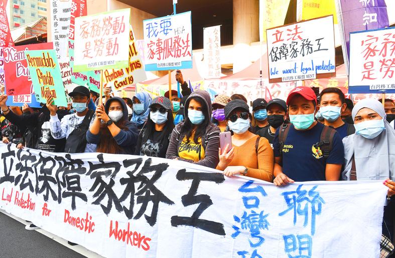 About 200 migrant workers and workers’ rights advocates yesterday rallied in front of the Legislative Yuan in Taipei to push for legislation to guarantee legal protection for domestic workers.