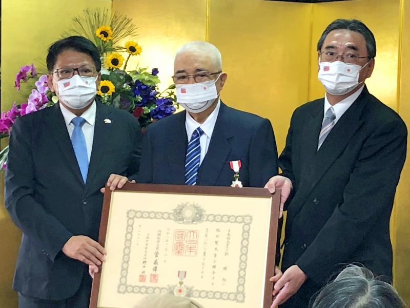 Liu Yao-tzu (劉耀祖), one of three Taiwanese to be honored with Japan’s Order of the Rising Sun last year, was yesterday presented with the medal by Japan-Taiwan Exchange Association Kaohsiung office director Eji Kato.
