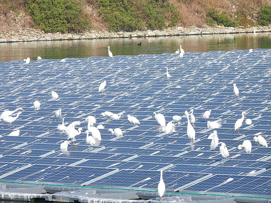 On Tuesday, the Budai Salt Pan Wetlands (布袋五鹽田) posted images on Facebook of birds resting on solar panels erected in a detention basin, while close-ups showed that the panels had been covered with the egrets’ droppings.