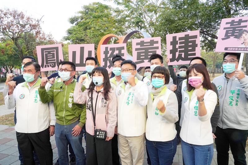 Independent Kaohsiung City Councilor Huang Jie, third left, is joined by members of the Democratic Progressive Party Kaohsiung city councilor caucus at an event in the city’s Fenghsan District to express support for Huang, who is subject to a recall vote on Saturday. The signs at the back reads: “Fengshan supports Huang Jie.”