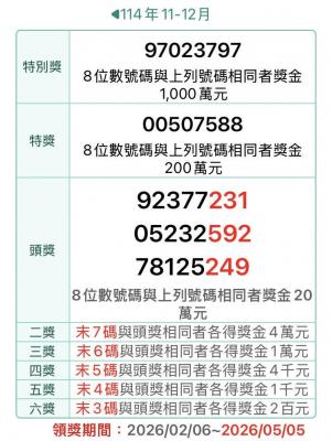 Seven of the 17 NT$10 million (US$311,604) winning receipts from the November-December uniform invoice lottery remain unclaimed as of today, the Ministry of Finance said, urging winners to redeem their prizes by May 5. The reminder comes ahead of the release of the winning numbers for the January-February lottery tomorrow. Among the unclaimed receipts was one for a NT$173 phone bill in Keelung, while others were for a NT$5,913 purchase at Costco in Taipei's Neihu District (內湖), a NT$49 purchase at a FamilyMart in New Taipei City's Tamsui District (淡水), and a NT$500 purchase at a tea shop in New Taipei City's