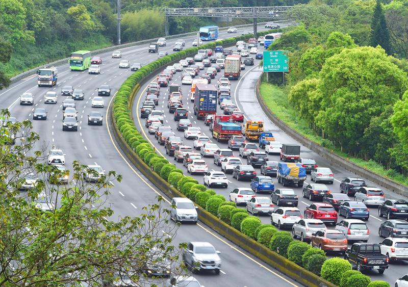 Vehicles travel in heavy traffic along the southbound lanes of the Formosa Freeway (Freeway No. 3) in New Taipei City yesterday. The congestion, which reduced the average speed to under 20kph, was caused by people traveling south for the three-day 228 Peace Memorial Day weekend.