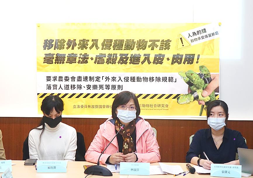 Democratic Progressive Party Legislator Lin Shu-fen (林淑芬) yesterday called for regulations on the extermination of invasive species, after images emerged on the Internet showing a man killing a green iguana by placing a firecracker in its mouth.
